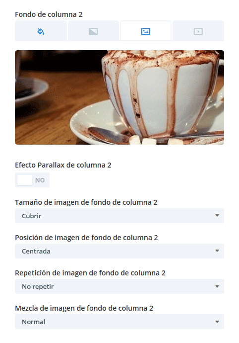 Para las imágenes se han incluido algunas opciones nuevas, como el tamaño, la posición y la repetición, otorgando mayor control sobre la manera en que se visualizan como fondo, tanto en la fila como en las columnas. La opción de Mezcla es otro añadido destacado, que es el efecto que tomará la imagen al “interactuar” con el color de fondo.
