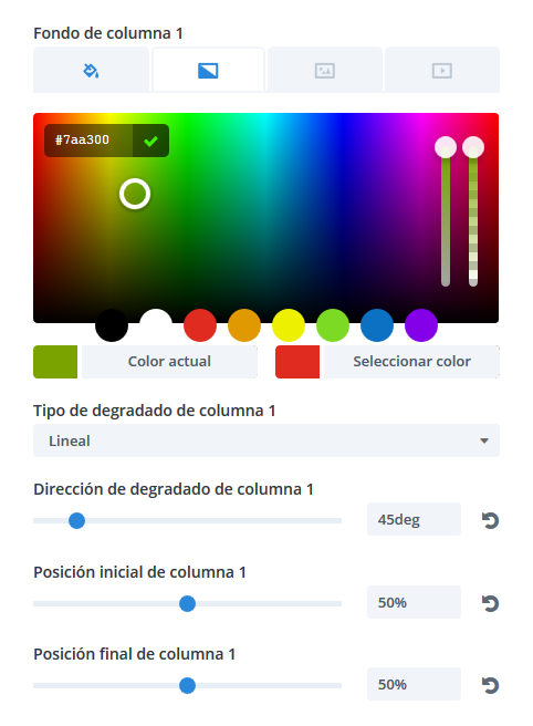 Para los degradados se pueden seleccionar los dos colores, el tipo de degradado (lineal o radial), la dirección o ángulo, y las posiciones inicial y final.